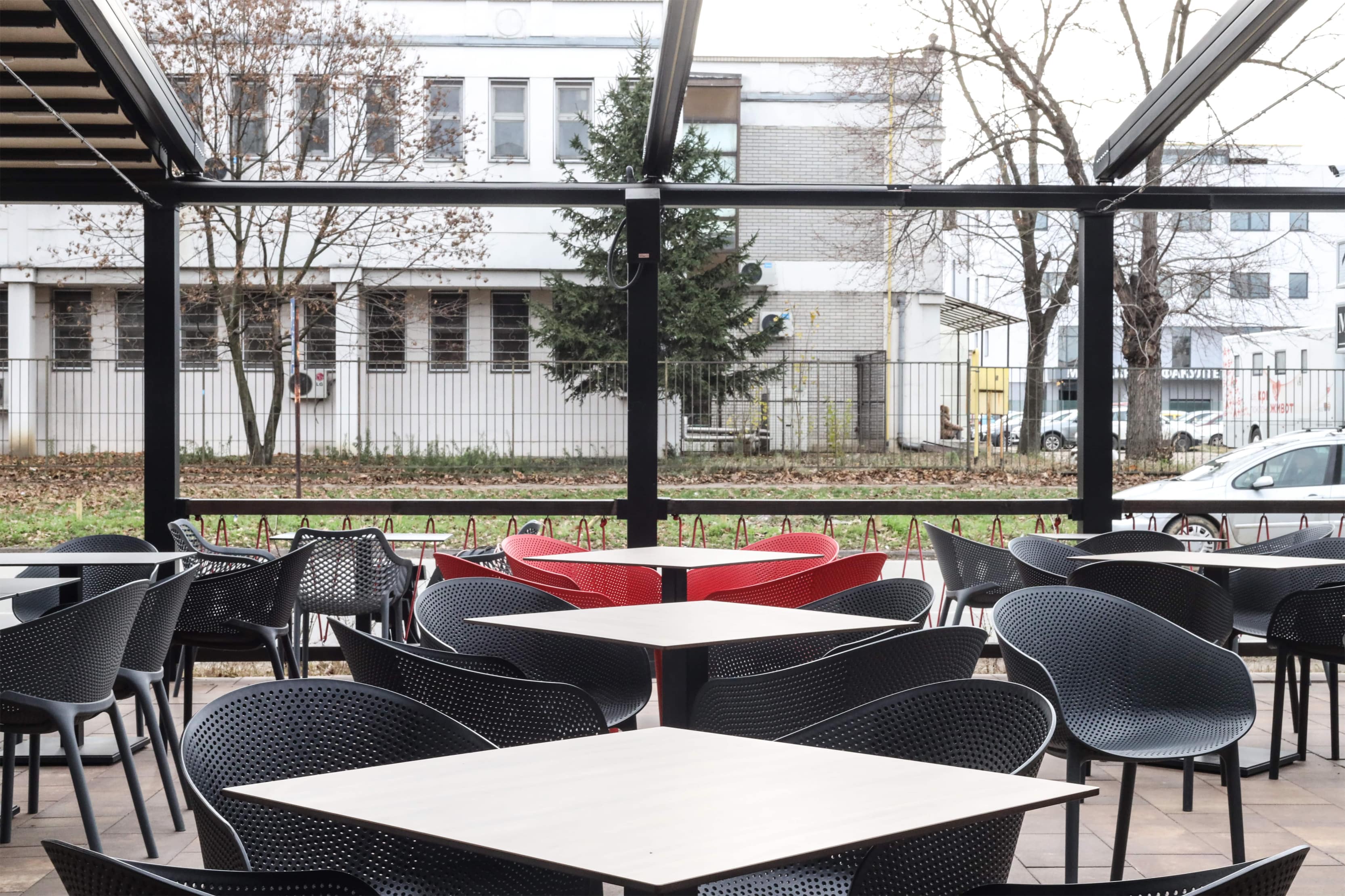 Ploče stolova čini Fundermax Compact. Zbog izuzetne izdržljivosti, Fundermax Compact koristi se u zonama koje se često upotrebljavaju i intenzivno čiste.